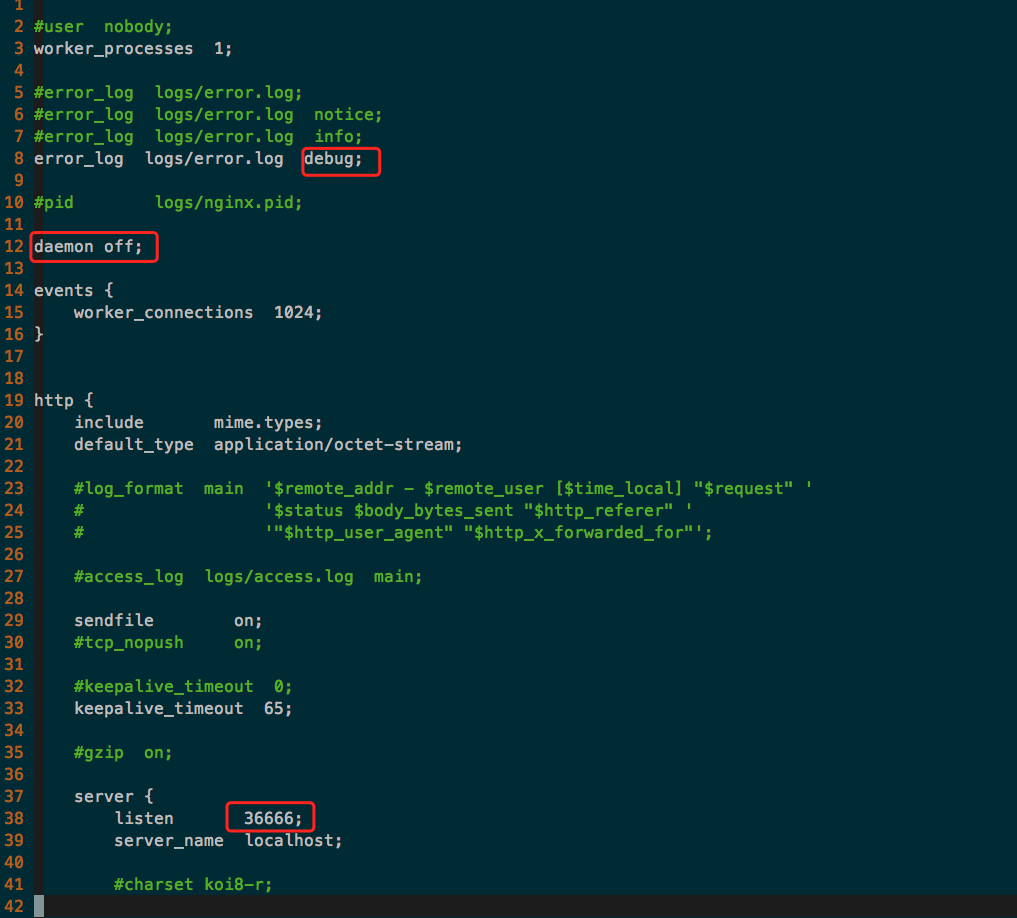 我们先改一下配置文件,主要改三个地方,日志级别、监听端口和单进程模式,如图: