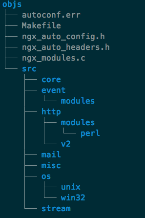 我们主要看里面两个头文件和一个源文件,两个头文件是生成的一些宏定义,nginx源码里面用到很多宏,到时可以回到这里看,ngx_modules.c则是所有模块的数组,这个我们后面再说,objs/src里面只是一些空文件,目录结构跟源码目录src结构一样,是为了放编译过程生成的目标文件。现在我们来编译一下。